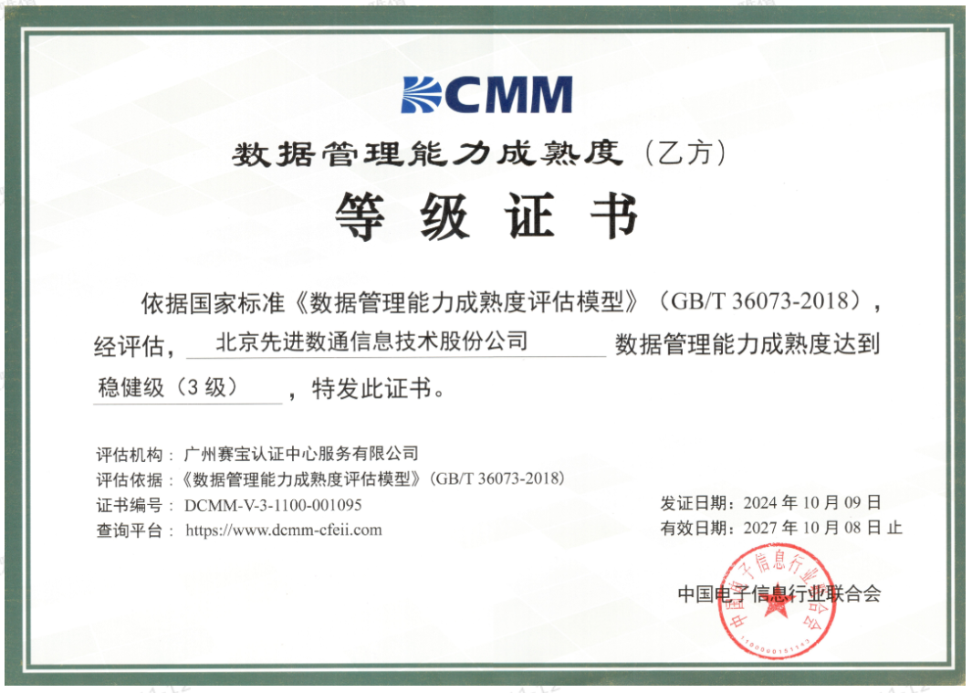 近期,中国电子信息行业联合会公布了最新一批顺利获得数据管理能力成熟度(DCMM)贯标等级认证的企业名单。918博天堂官网成功取得数据管理能力成熟度稳健级(三级)认证。这一认证的取得,标志着918博天堂官网在数据治理体系构建和数据管理与应用能力方面,已经达到了国家权威组织认可的标准。这不仅是对918博天堂官网在数据管理领域专业能力的肯定,也是对其在有助于数字化转型服务和数据驱动决策方面所做努力的认可。